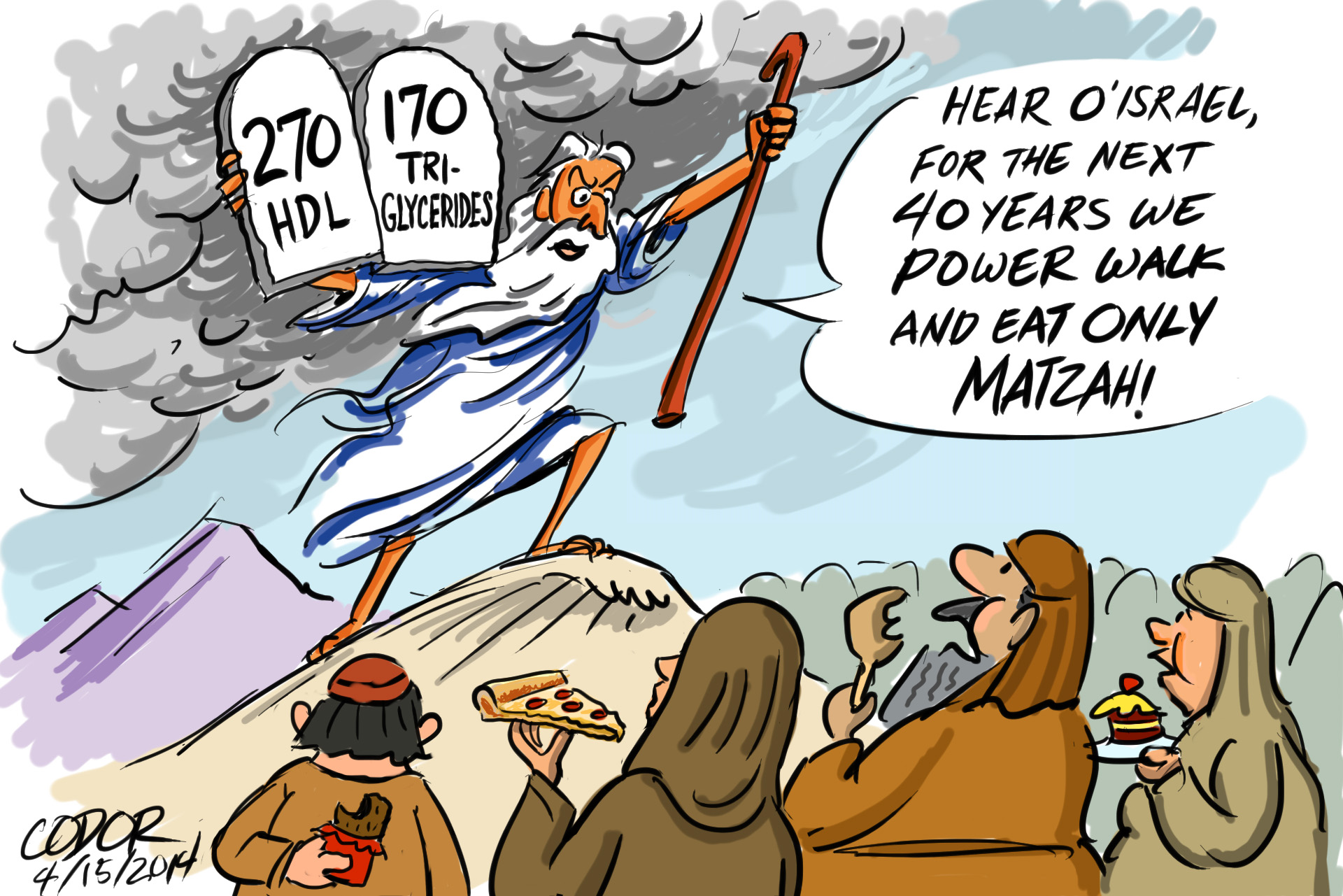 April 12, 2014 in Passover | Tags: HDL, humor, jewish cartoon, Matzah, Passover, Power Walk, Spring, Triglyceridees | by codorcartoons | Leave a comment